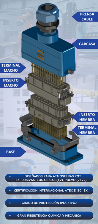 Conectores rectangulares diseñados específicamente para su uso en atmósferas potencialmente explosivas. Cuentan con certificaciones internacionales ATEX e IECEx, permitiendo una conexión segura, rápida y fiable en zonas con riesgo de explosión. Fabricados en cinc fundido a presión, con un distintivo recubrimiento azul conforme a los estándares para atmósferas explosivas. Ofrecen grado de protección IP65/IP67, resistencia química y mecánica, y total compatibilidad con insertos de la gama Han®.