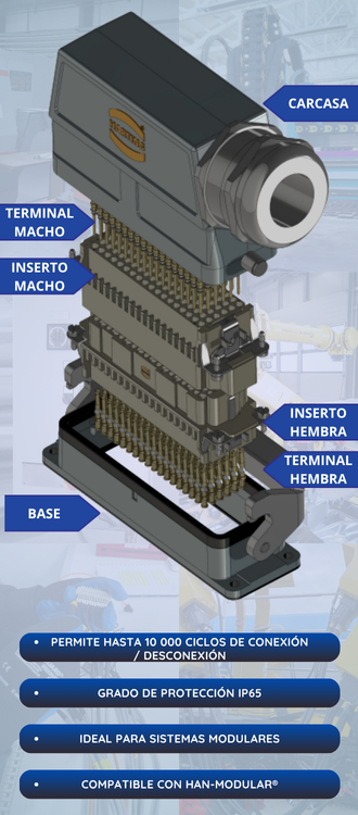 Compatible con la serie Han-Modular®, siempre y cuando se usen terminales Han E/EE/EEE/DD/DDD Module HMC de crimpado montados en el Docking Frame.