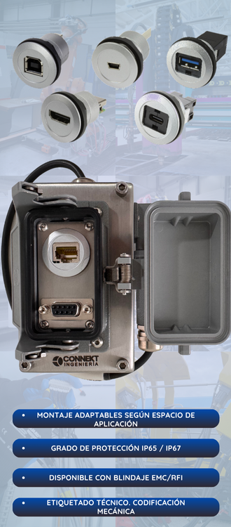 En Connekt Ingeniería diseñamos y fabricamos puertos de servicio a medida, utilizando conectores industriales como RJ45, USB, HDMI, M12, D-sub, entre otros, de acuerdo al tipo de señal, el entorno y el nivel de protección requerido. Nuestros puertos permiten el montaje en tapas, puertas, envolventes o estructuras metálicas, y se entregan completamente ensamblados, probados eléctricamente y listos para conectar, tanto desde el exterior como hacia el interior del sistema.